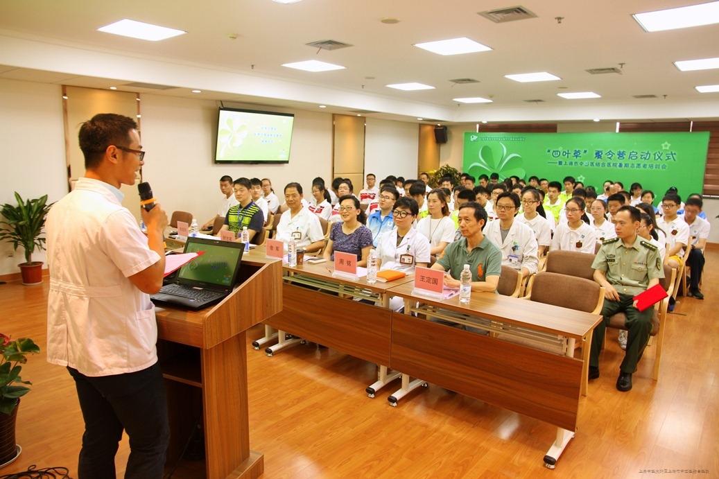 7月29日,我院在12楼多功能厅举行了“四叶草”夏令营启动仪式暨上海市中西医结合医院暑期志愿者培训会。市卫计委新闻宣传处俞军副处长、区卫计委宣教科张连华科长、区志愿者协会王定国老师及我院舒志军院长、党委周铭副书记参加了本次活动,武警一支队十中队指导员和来自复兴高级中学、鲁迅高级中学的志愿者们,以及街道社区的青年志愿者们参加了此次培训。活动由我院社工科负责人盛德俊主持。