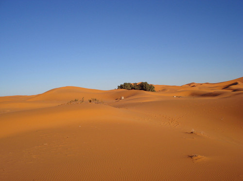 第二天,我们在Rachidia吃过早餐开始了真正的沙漠之旅。首先乘汽车到黑扎里(Rissani),再搭乘Taxi到达撒哈拉沙漠入口门户梅合组噶(Merzouga)。这是一座沙漠明珠般旅游小城市。呈现眼帘的是宽阔的柏油马路,路两边是一些不知名的沙漠植物,还有星罗其布的各种Hotel和Restaurant掩映其中,外观象土堡,一点也不显眼,可走进里面却眼前一亮,里面布置气派,满是阿拉伯特色的装饰,泳池荡漾,三三两两世界各国各种肤色的旅游者围坐在一起喝着咖啡,谈笑风生。