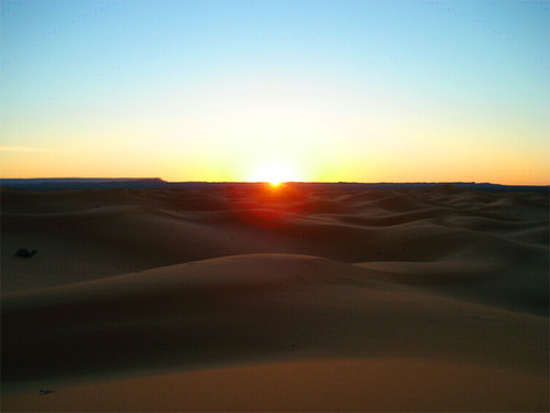 进入沙漠,放眼望去,金黄色的沙漠无边无际,绵延不断。由于风的作用,千形万状的沙丘真是美妙极了。我第一次见到浩瀚的沙漠,完全被这胜景陶醉,忘记了旅途的颠簸劳累,下午7点太阳快要落山,向导在一个小沙丘腹地停下,示意我们下骆驼、观沙漠日落。