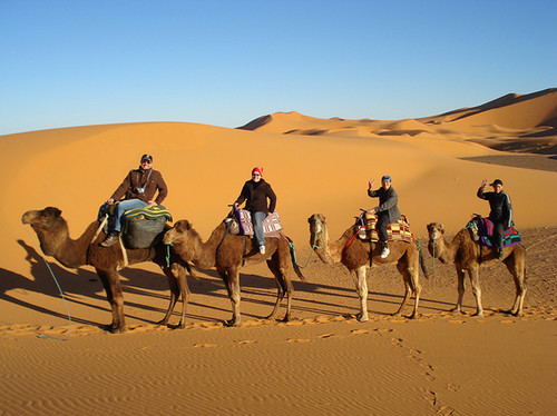 由于沙漠地区白天和夜晚温差很大,到达这里的旅游者都和当地的居民一样“昼伏夜出”,白天躲在旅馆里喝咖啡或者泡在泳池里以躲避日晒和高温,只有等到快日落之前才开始往沙漠里进发去观看沙漠日落景观。于是,我们等到下午4:30和一对比利时夫妻骑着骆驼在当地阿拉伯向导带引下向撒哈拉腹地进发。