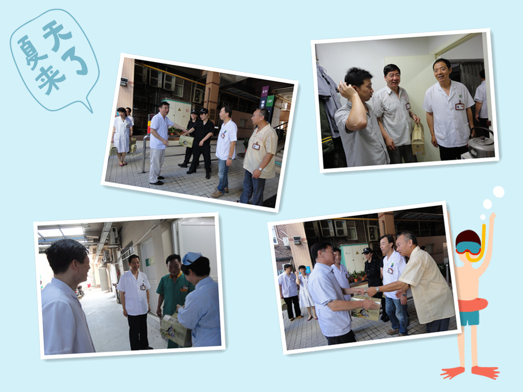 7月22日上午,顶着炎炎烈日,我院舒志军院长、郑慧明书记、谢春毅副院长、金琳副院长及工会领导、职能部门部分同志走访了煎药房、供应室、技工间、膳食科、保卫科等高温作业岗位,慰问了高温一线职工,并与在岗人员亲切握手,询问工作情况,送上慰问品,向他们的辛勤付出表示衷心感谢。