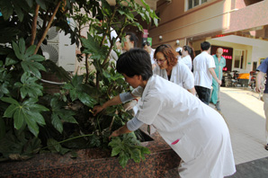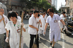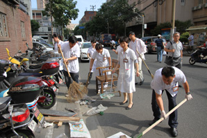 2015年8月19日下午,为进一步推进医院周边环境卫生整治工作,积极为病患营造整洁有序、安全卫生的就医环境,医院第六、第七党支部党员联合行动,来到门诊大楼及住院楼广场前,对外围区域进行了卫生大扫除。