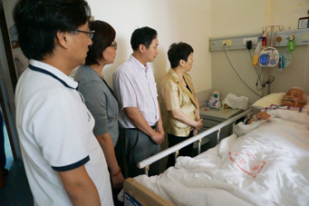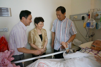2015年9月15日上午,区卫生计生委党工委书记郭海英、区医务工会主席李峰在我院舒志军院长、周铭副书记及脉管科医生的陪同下,前往市一看望奚老。几位领导与奚老热情握手并仔细询问病情,鼓励奚老积极配合治疗,早日恢复健康。